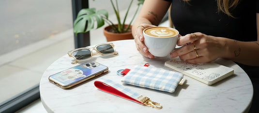 The ultimate hands-free accessory. Attach it to pouches, tote bags, backpacks to keep essentials close. Handmade Wristlet Keychain Denim Fabric & Cotton Webbing with Metal Hardware